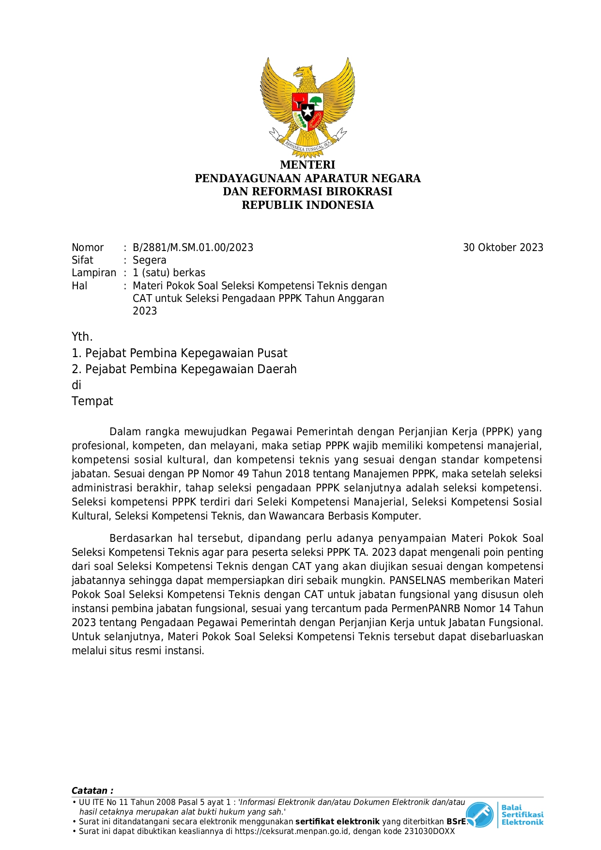 Materi Pokok Soal Seleksi Kompetensi Teknis dengan CAT untuk Seleksi Pengadaan PPPK Tahun Anggaran 2023
